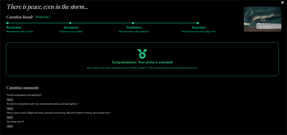 Once awarded by the Head Curators, the image will appear immediatly in the author’s 1x portfolio as awarded BUT it can take about 1-5 days before it will be featured on the front page. Means that your image is in the queue or ‘queued’.